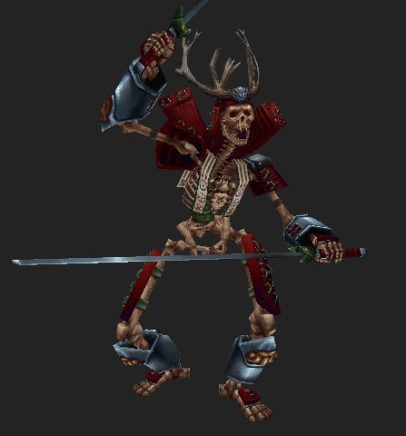 Original design inspired by the Game Artisans death knight competition, but was not finished in time. Part Samurai, with Icelandic design influences, he's an animated skeleton. 1,999 triangles and 512x512 RGBA texture. Animated gif spin. The model and texture zip can be downloaded here.