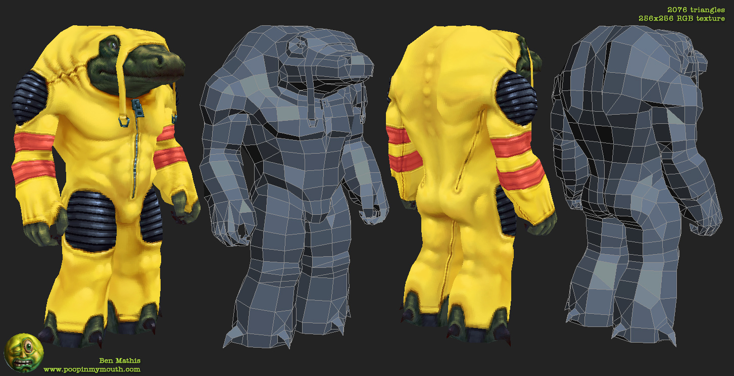 The studio provided a 2D concept from one angle, and gave me a texture limit and triangle count (735 triangles plus a 512x512 RGBA texture). I needed also keep track of total completion time which was 14 hours including rigging.