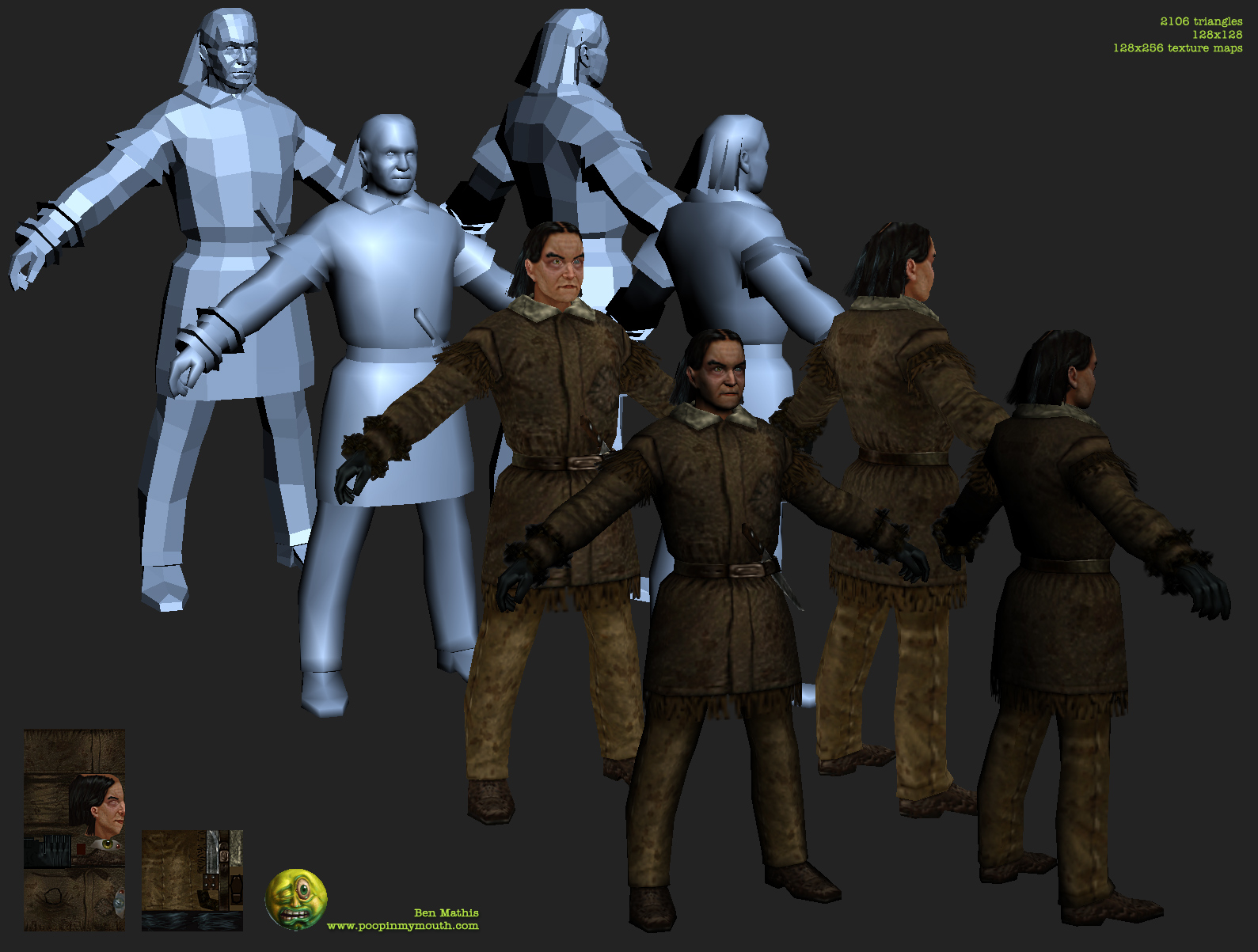 Made for the 2nd mini-comp on GameArtisans.org. 506 triangles, 256x256 RGB texture. I was sketching ideas and just thought of a racoon-like character with a fur hoodie, and Greg was born. Download the model and texture zip.